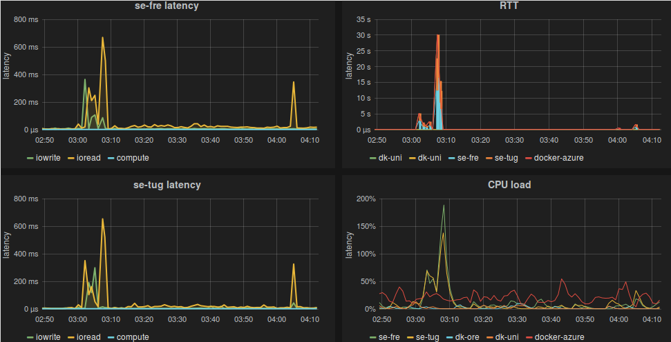 The first set of graphs shows I/O latencies and compute of four VMware clusters. Two in Stockholm(se-fre and se-tug) and two in Copenhagen (dk-uni and dk-ore).
